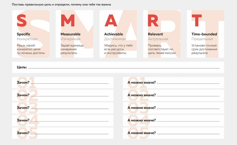 SMART – это аббревиатура, которая расшифровывается как: Specific (Конкретная), Measurable (Измеримая), Achievable (Достижимая), Relevant (Актуальная), Time-bound (Ограниченная во времени). Каждая буква этого слова – это критерий, которому должна соответствовать ваша цель. Давайте разберем каждый из них подробнее.